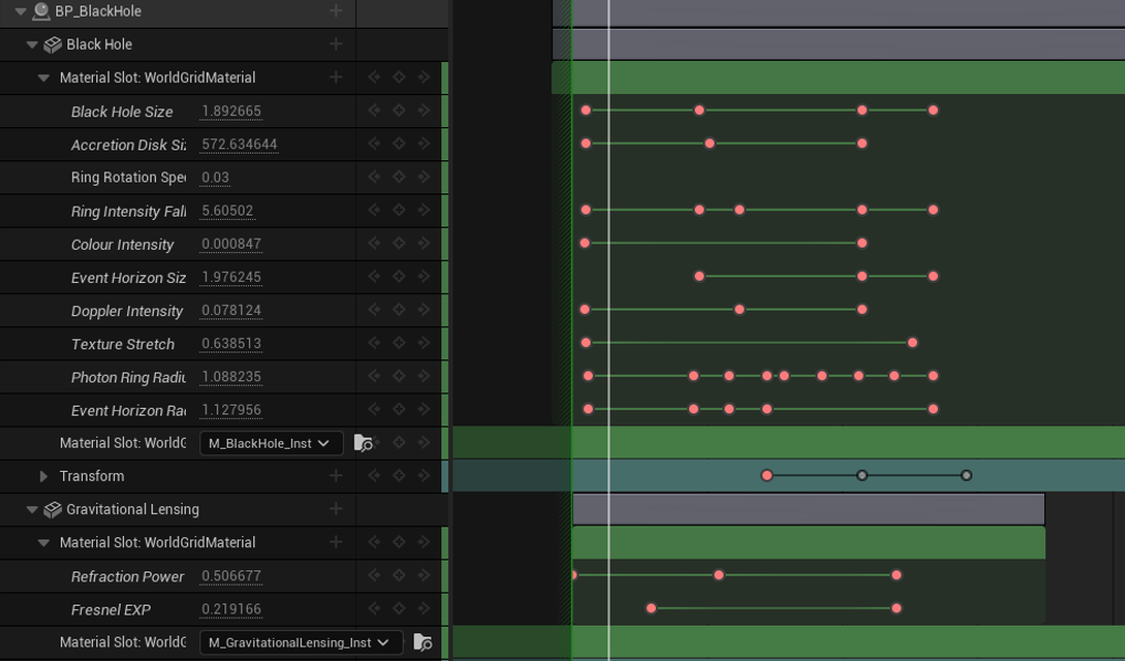 Adjustable parameters for both the Black Hole and Gravitational Lensing Material were exposed in sequencer to create a smooth transition from black hole seed to a fully formed black hole.