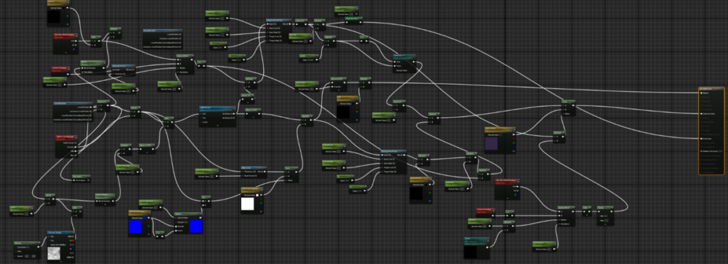In Unreal Engine, a complex material was created to extract the attributes extracted from Houdini (density, colour, position) and assign them to an array of exposed parameters for a creatively directed volume. This material was assigned to a blueprint called “Heterogenous Volume” which allows UE5 to render out these volumes in real time.